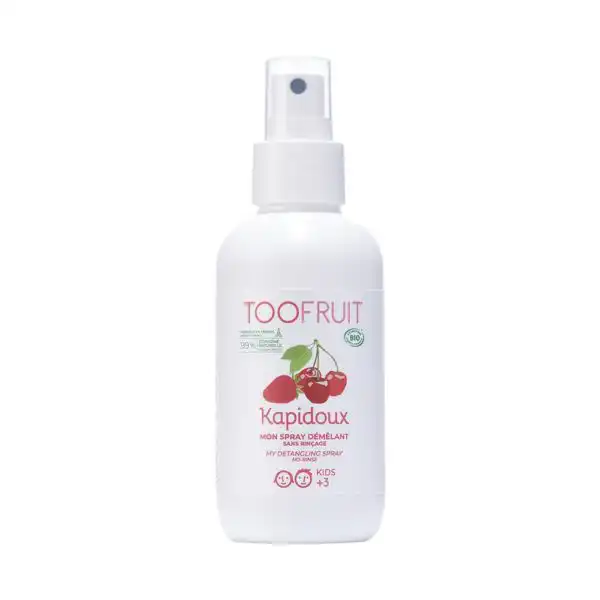 Le Spray démêlant Kapidoux TOOFRUIT est conçu pour tous les types de cheveux. Il laisse un fini doux et brillant. Il s’applique sur cheveux humides, après le shampoing, ou au moment de se démêler les cheveux sur cheveux secs.