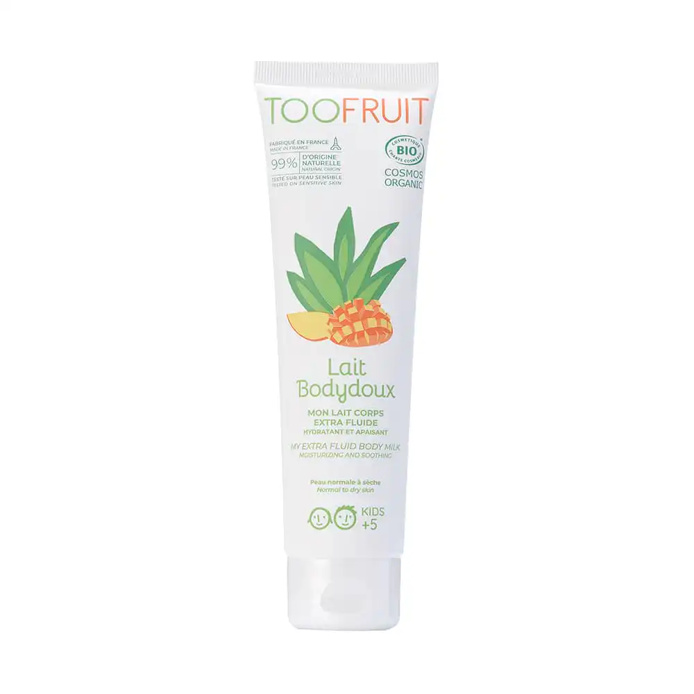 Le lait Bodydoux de TOOFRUIT, c’est LE lait fluide certifié bio, spécifiquement conçu pour les enfants. On l’utilise en rituel de soin quotidien après la douche ou le bain, toute l’année et en toute saison. Il permet de garder une hydratation régulière de la peau sans la soumettre à des épisodes de sécheresse. Facile à appliquer avec sa texture légère, le lait est rapide à faire pénétrer contrairement à des crèmes plus riches demandant plus de soin. La peau est souple, saine et resplendissante immédiatement.