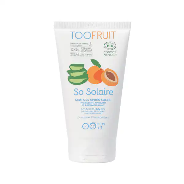 Chez TOOFRUIT, le gel après-soleil So Solaire est un produit de soin aux mille et un atouts : il apaise les coups de soleil, réhydrate la peau et apporte une sensation de fraicheur immédiate ! Sa formule 100% naturelle est fabriquée en France, certifiée biologique, vegan et testée sur peau sensible. Le tout dans un tube en plastique recyclé. Il est spécialement conçu pour prendre soin de la peau des enfants dès 3 ans.